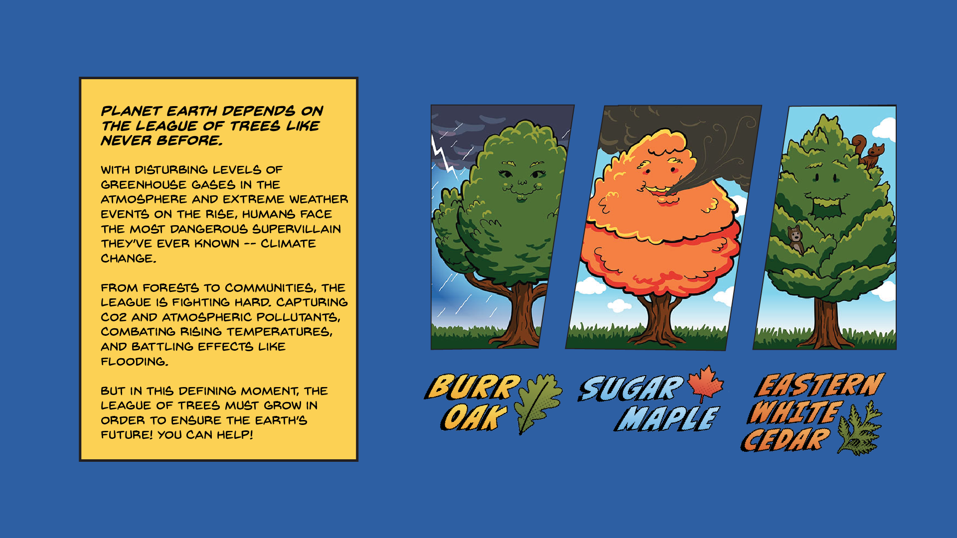 These big, powerful plants quietly fight climate change, capture carbon, manage water, and provide homes for wildlife every day. Pretty heroic stuff by any Ontarian’s account. The League of Trees felt inevitable.