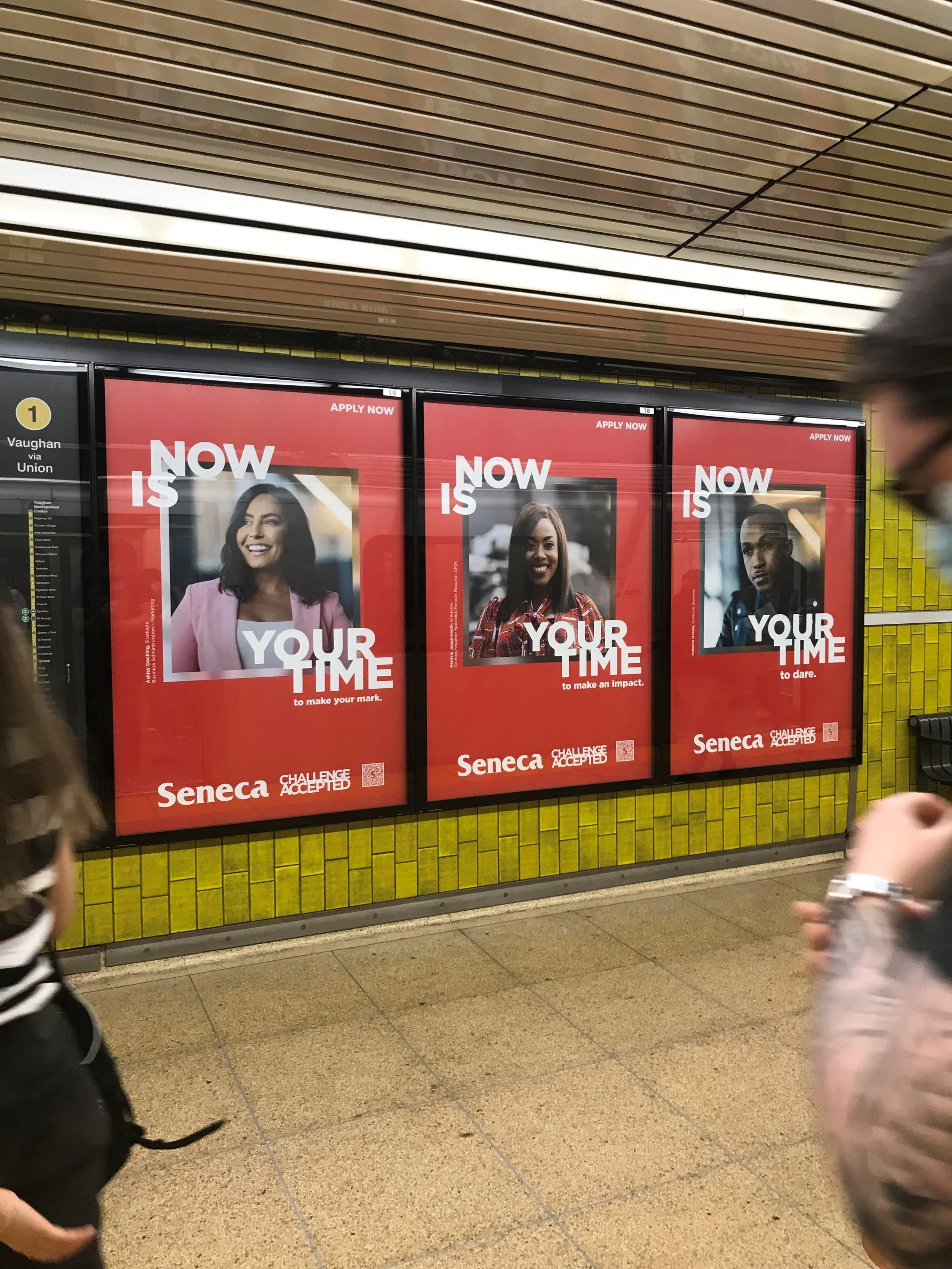 The work blended cinematic footage with raw phone captures, TikTok loops, and Instagram Live-style clips to create immediacy and texture. Every mix of media reinforced that challenges are happening now, and that Seneca equips students to meet them.